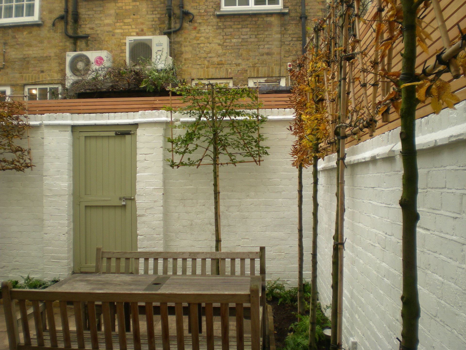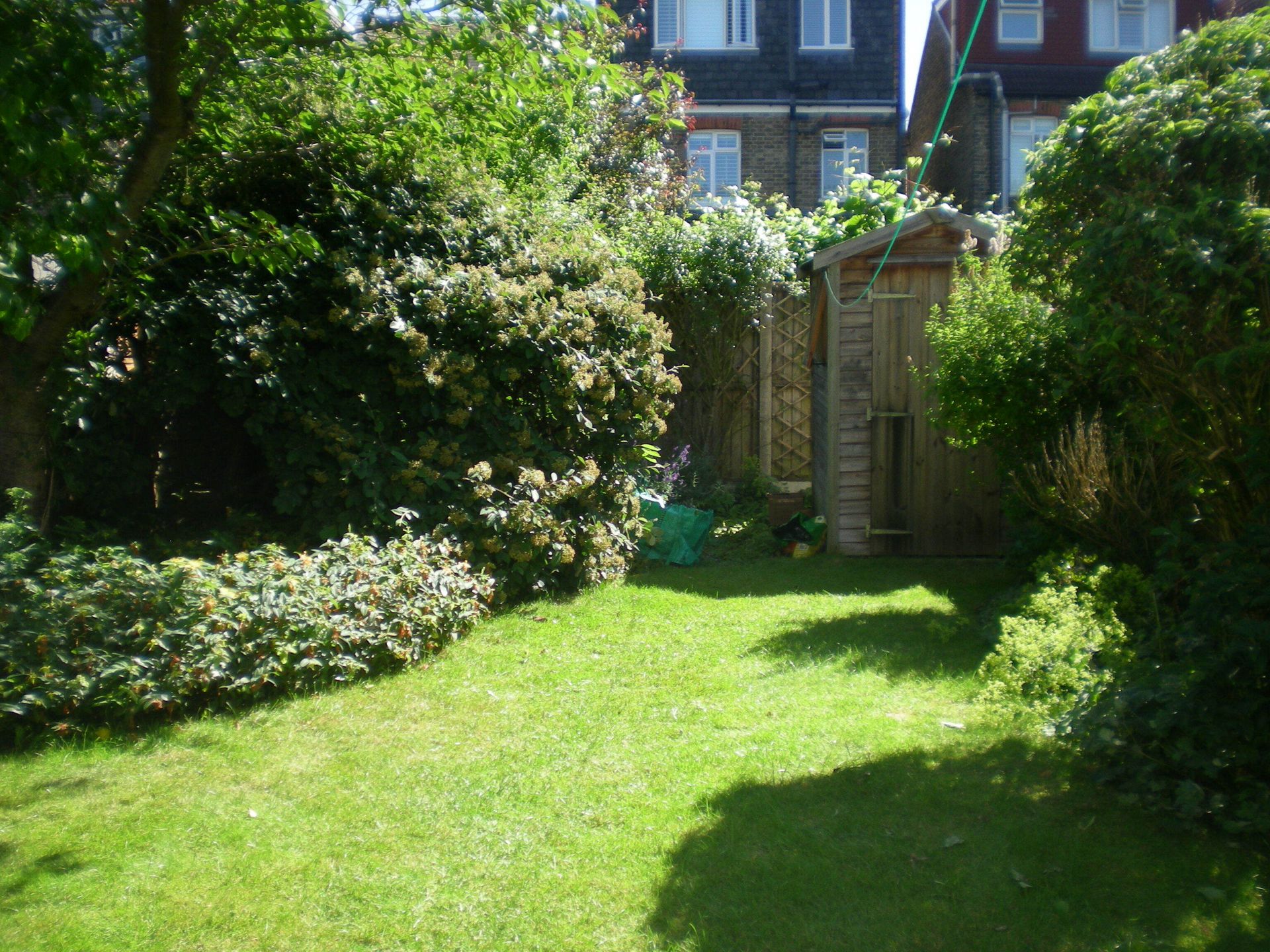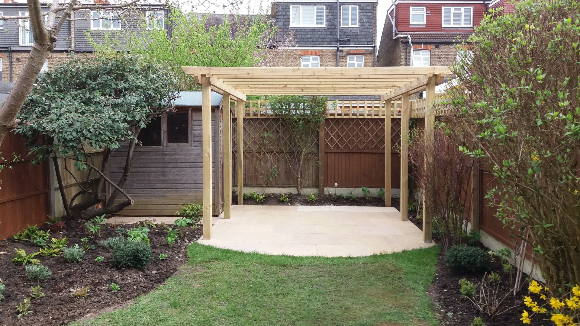 Before & after in Ealing - trees cut back, new planting and the addition of a seating area under a pergola, with the shed moved to the side:
