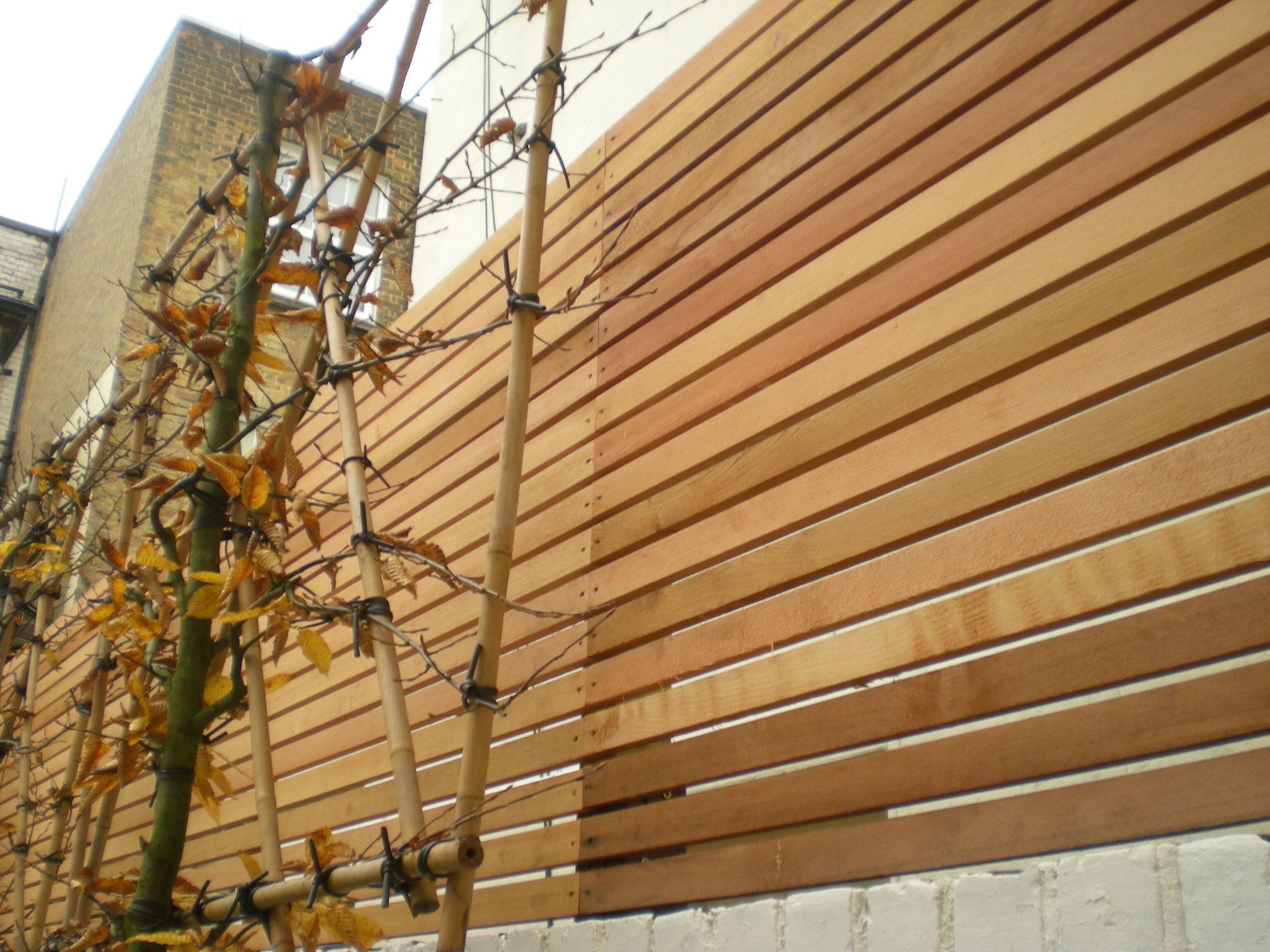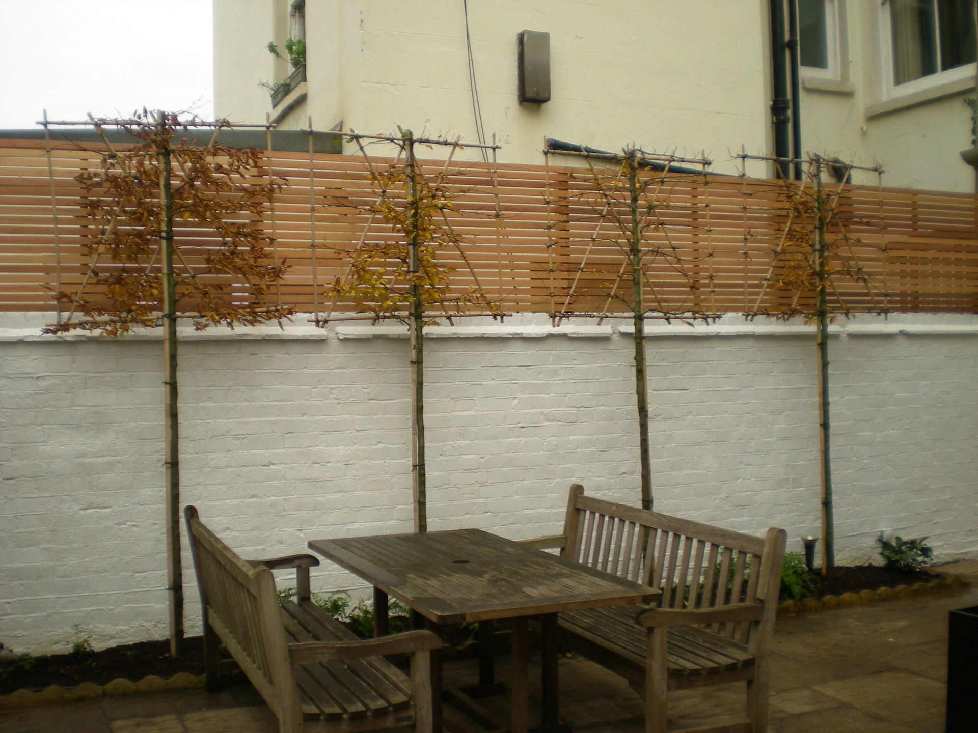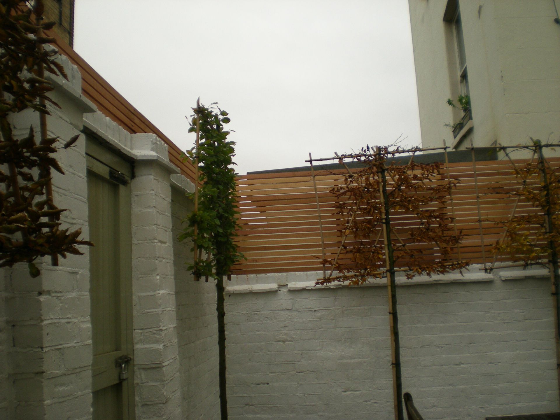 Before & after in Ealing - trees cut back, new planting and the addition of a seating area under a pergola, with the shed moved to the side: